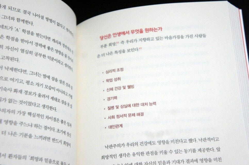 이 책에서는 다양한 사례를 통해 그 안에서 우리 스스로 희망을 배우는 연습을 하도록 도움을 준다. 특히 [희망을 채우기 위해 지금 당장 해야 할 일]을 스스로 써나가며 생각해 볼 수 있다. 의미는 발견되는 것이 아니라 우리가 직접 만드는 것이라는 생텍쥐페리의 말처럼, 긍정적인 생각이나 희망도 거저 주어지는 것이 아니라 우리가 만들어나가야 하는 것임을 깨닫는다. 그 안에서 의미를 찾을 수 있도록 길을 안내해 주는 자기계발서이니 활용해보면 좋을 것이다.