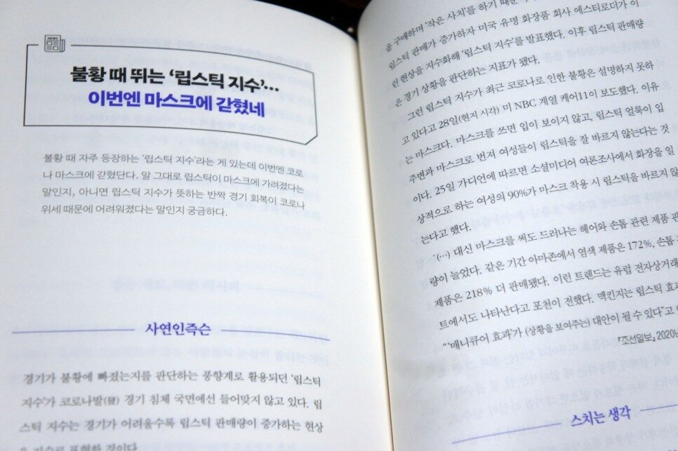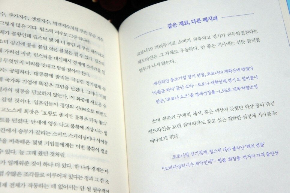 이 책은 총 5장으로 구성된다. 1장 '유쾌한 헤드라인'에는 군산 꽃새우에 항복한 새우깡, 'ㅎㅎㅎ 전략'으로 위기 넘는다, "한국서 군함 샀더니 마스크, 소독제가 딸려왔습니다" 등이, 2장 '유익한 헤드라인'에는 조회 수가 곧 돈이라서…혐오를 팝니다, 항공 마일리지 '날아갈 일' 없게 한다, 쥐띠해 부자 되려면 고양이 잡아라, 씁쓸한 '1코노미' 확산 등이, 3장 '참신한 헤드라인'에는 '품절'이라 쓰고 '배송문제'라고 읽는다, 거실로 퇴근했다, 나의 호의가 당신의 권리가 될 때 등이, 4장 '궁금한 헤드라인'에는 도둑은 토요일 새벽 3시를 노린다, '노란 조끼'는 왜 그 식당을 습격했을까, 빌 게이츠의 후회, 불황 때 뛰는 '립스틱 지수'… 이번엔 마스크에 갇혔네 등이, 5장 '심오한 헤드라인'에는 제로페이는 착하지 않다, 김정은이 주목하는 세 가지 숫자 등이 수록되어 있다.