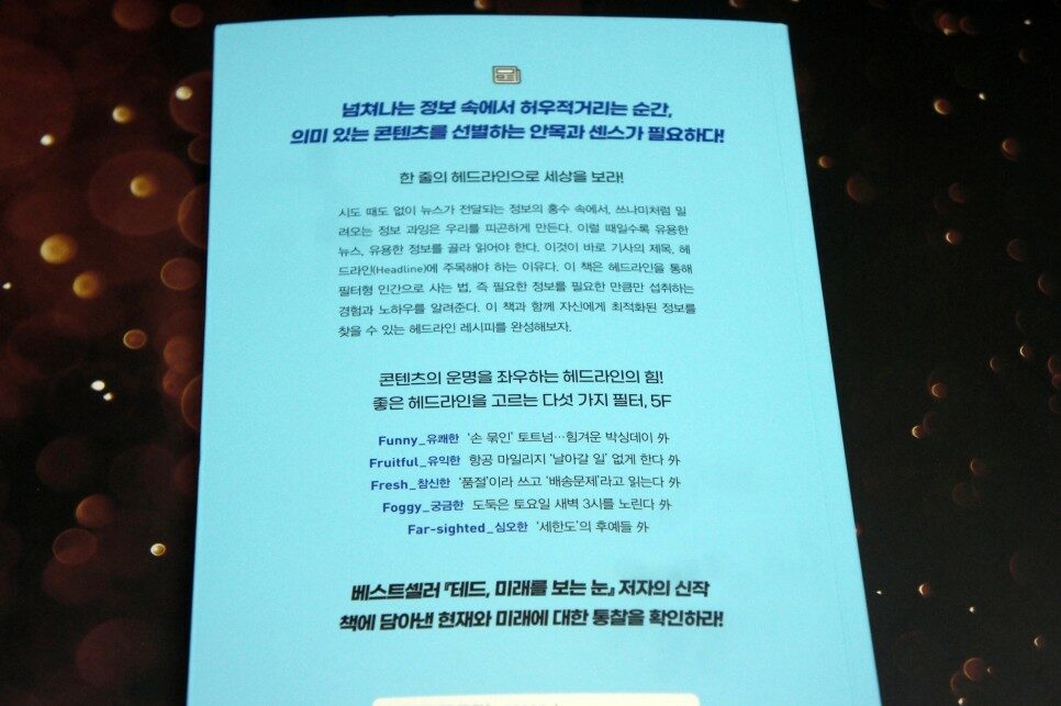 시도 때도 없이 뉴스가 전달되는 정보의 홍수 속에서, 쓰나미처럼 밀려오는 정보 과잉은 우리를 피곤하게 만든다. 이럴 때일수록 유용한 뉴스, 유용한 정보를 골라 읽어야 한다. 이것이 바로 기사의 제목, 헤드라인에 주목해야 하는 이유다. 이 책은 헤드라인을 통해 필터형 인간으로 사는 법, 즉 필요한 정보를 필요한 만큼만 섭취하는 경험과 노하우를 알려준다. 이 책과 함께 자신에게 최적화된 정보를 찾을 수 있는 헤드라인 레시피를 완성해보자. (책 뒤표지 중에서)