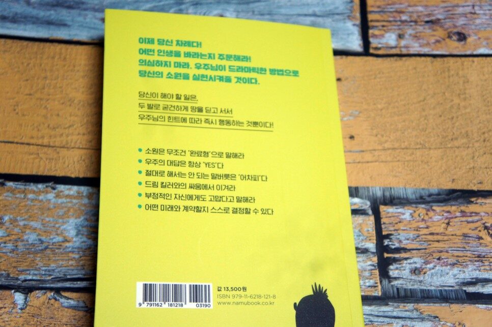 우주에는 '기적'이 남아돈다. 많은 사람들이 "역시 무리야.", "어차피 나한테는 무리였어."라는 식으로 쉽게 주문을 취소하기 때문이다. 기적은 우주의 입장에서 보면 당연한 현상이지 특이한 현상이 아니다. 어떤 주문이든 즉각적으로 이루어지는 세계가 우주다. 사람은 모두 각자의 우주를 가지고 있다. 본인의 우주에 본인이 거주하는 장소가 없을 리 없다. 순수하고 솔직하게 주문을 내고 힌트를 받아 행동으로 옮기면 어떤 소원이라도 반드시 이루어진다. 우선, 기적을 일으키는 "감사합니다!"라는 말버릇을 갖추고 우주와 연결되어 있는 잠재의식의 파이프를 깨끗하게 만들자. 그리고 소원을 주문한 뒤에는 절대로 취소하지 말자! (25쪽)