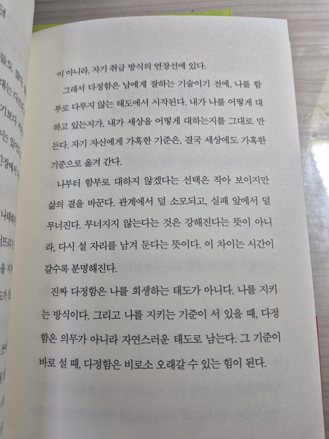 특히 다양한 사례와 이야기를 통해 삶에 대해 표현하고 있는 점이나 나이가 든다는 의미가 무엇이며, 나에 대한 이해나 관리의 중요성, 낮아진 자존감의 회복 방식이나 어려운 인간관계의 경우 어떤 형태로 배우며 새롭게, 혹은 주도적인 관리, 대응 등이 필요한지도 책을 통해 접하며 생각해 볼 수 있는 부분이다. 이는 누구에게나 해당 되는 중요한 부분이지만 이를 현실에서 적용할 경우 서로 다른 방식과 반응, 입장 차이 등이 존재하는 예민한 부분이기도 해서 더 어렵고 복잡하게 느껴지는 것도 사실이다.