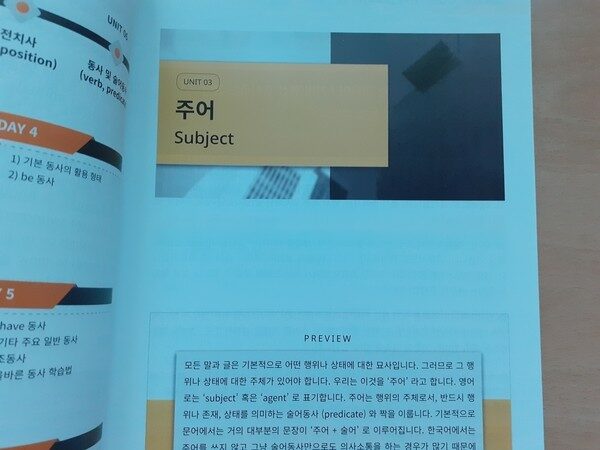 총 24장으로 되어 있으면 기초적인 알파벳과 문법 용어 정리부터 시작한다. 영어의 8품사와 5형식, 구와 절, 자동사, 타동사, 수동태, 분사, 동명사, 가정법, 완료시제 등 영어 문법을 공부하면서 익혔던 용어들이다. 이렇게 용어를 익히면 한국어와 영어의 차이를 알게된다. 한국어와 영어의 차이점으로 흔히 거론되는 주어와 술어의 위치에 의한 비교는 차이가 아니다. 한국어에서는 각 단어의 위치가 말의 의미를 제대로 구현해내는 결정적인 요소가 아니기 때문이라고 할 수 있다. 영어는 토씨에 의해서가 아니라 위치에 의해, 각 낱말의 역할이 결정되는 언어이다. 이를 잘 이해하고 주어나 전치사, 동사 및 술어동사, 후치수식, 등위접속사, 형용사, 수일치, 부정사, 분사, 시제, 조동사, 가정법, 비교, 관계사절 등을 공부할 수 있다.