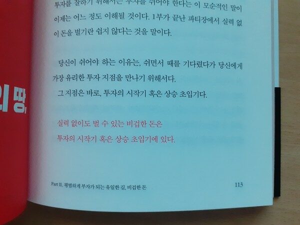 자신의 시간을 쓰면서 최대한 스트레스 받지 않는 방법을 찾아야 한다. 게으름을 통해 자신이 하는 일을 할 에너지를 비축한다. 스트레스 없이 시간을 온전히 쏟을 한 지점을 발견하고 게으름을 통해 그 지점에 온 힘을 쏟을 준비를 하는 것이다. 게으르다라는 단어는 초집중이라는 단어로 대체되었다. 자신의 게으름을 받아들이고 자신만의 시간을 사용하는 과정에서 억지로 스트레스받으며 정작 중요한 일을 낮은 질로 해내지 않아야 한다. 제목의 '비겁한 돈'은 돈을 벌 실력은 없지만 돈을 벌고 싶은 것, 이것이 비겁한 마음이다. 비겁한 돈은 시장 상승기 초입의 대세감을 레버리지 삼아 벌이는 돈이다. 비겁한 돈은 투자를 최고 효율로 할 수 있게 만드는 비법이다. 수많은 전문가들은 비겁한 돈을 독이라 이야기한다. 하지만 비겁한 돈이야말로 평범한 사람들이 뛰어난 투자자가 되는 최적의 방법임을 말할 것이다. 돈은 비겁하게 버는 것이 가장 좋다. 비겁하다는 말의 이면에는 빠름과 편리하도 포함되어 있다. 가장 편하게, 현재 수준에서 가장 편리하게 돈을 버는 유일한 방법은 비겁해지는 것이다. 비겁한 돈이란 인애하며 기다린 사람에게만 주어지는 투자의 황금 시기를 의미한다. 모든 투자물에는 도저히 돈을 잃을 수 없는 시기가 존재한다. 이 시기를 잡는 사람은 실력에 상관없이 승리하는 투자자가 될 수 있다.