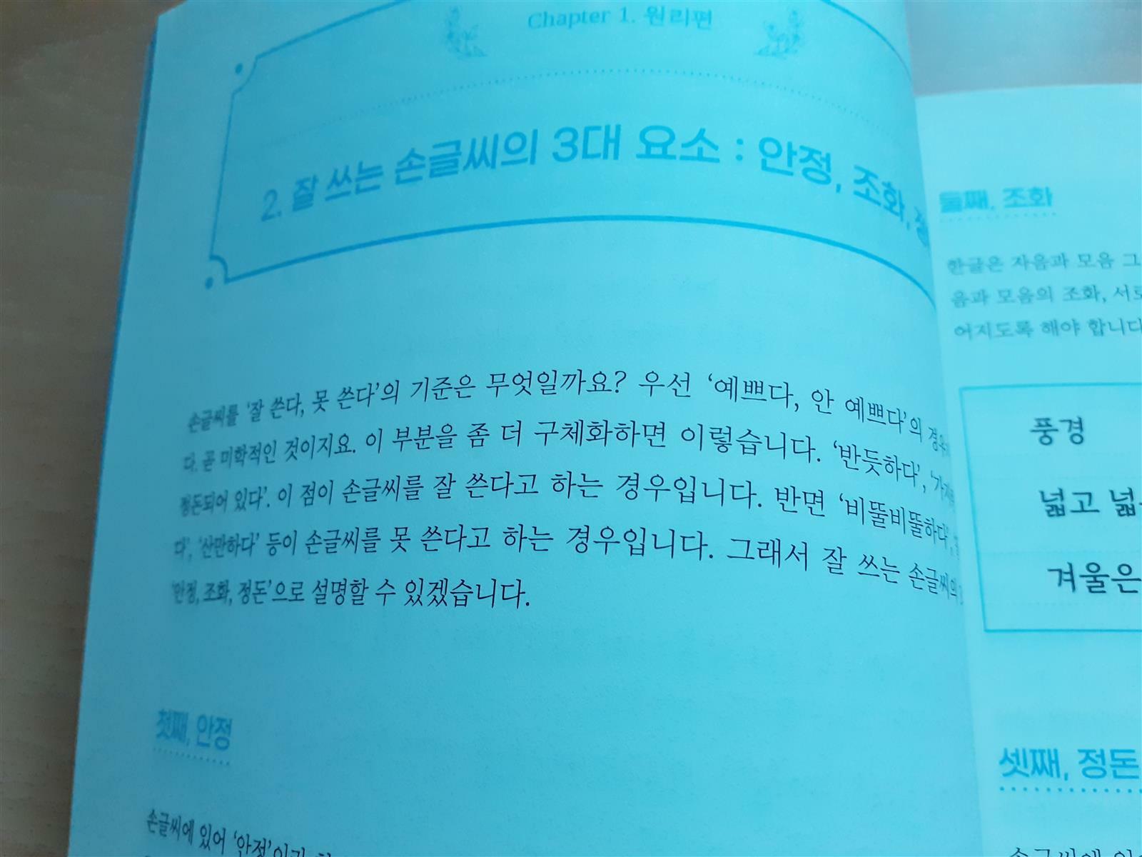 좋아하고 쓰고 싶은 손글씨가 있는데 손글씨로 성숙한 어른의 글씨체를 만들고 싶다. 정치인들이나 유명인들이 남긴 방명록의 글씨를 보면 '멋지다'라는 손글씨를 보게 된다. 그런 손글씨는 아무나 가질 수는 없는 것처럼 느껴지는데 연습과 함께 그 사람의 내면이 밖으로 나오는 것이 아닐까 싶다. 보통 손글씨라고 하면 아름다움에 초점을 맞춘다고 하는데 아름다움도 중요하지만 누구나 알아볼 수 있는 깔끔하고 자연스러운 손글씨였으면 한다. 손글씨의 핵심은 꾸준히 연습하는 것이라고 한다. 좋은 손글씨를 얻는 방법은 얼마만큼 지속적으로 연습을 하는가라고 한다. 하루아침에 잘 되는 게 아니기 때문에 끈기를 가지고 계속 연습해야 한다. 그래서 <손글씨가 나를 바꾼다>는 원리편과 실전편, 종합편으로 나누어 손글씨 연습을 한다. 원리편에서는 손글씨의 제1원칙으로 가독성과 명확성을 익힌다. 서체나 글자 넓이 극자 높이, 글자 간격, 띄어쓰기, 정확성 등을 익히게 된다. 가독성은 얼마나 잘 읽히느냐인데 손글씨는 무조건 잘 읽혀야 한다. 그래서 한 단어를 쓰더라도 글자간의 간격이나 띄어쓰기, 글자의 높이까지도 신경써야 한다. 그래서 기초적인 연습으로 한글의 구성인 선과 원, 모음이나 자음, 받침 등을 집중적으로 연습한다.