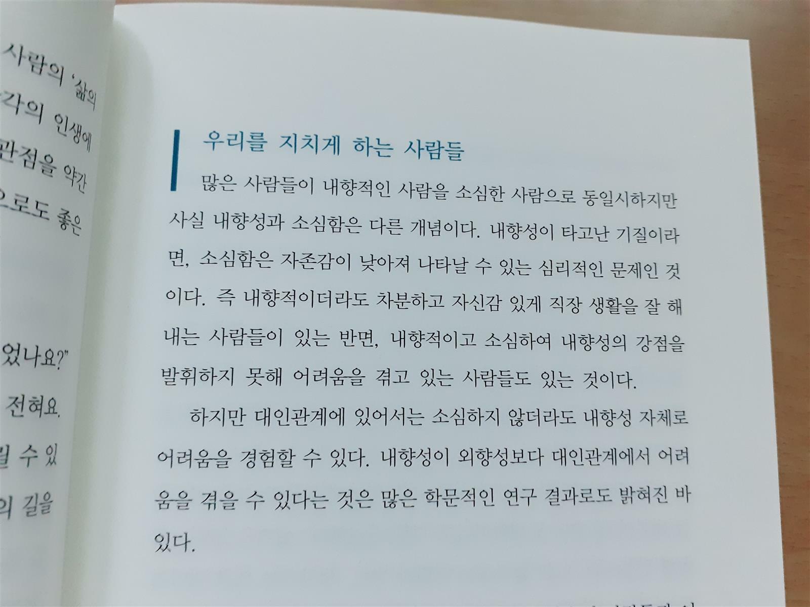 성격유형검사인 MBTI검사를 안 해 본 사람이 없을 정도로 한때 엄청난 인기를 끌었다. 이젠 처음 만나는 사람에게도 MBTI 성향에 대해 물어볼 수 있을만큼 대중화되었다. MBTI에서 외향적인 성격은 'E'로, 내형적인 성격은 'I'로 대표된다. MBTI검사를 했더니 'I'로 시작되는 성향이라는 것을 알게되었다. 내향적인 사람은 많지만 내향적인 성격을 그대로 가지고 직장 생활을 제대로 할 수 없다. 소심한 성격은 직장 생활에서 어려움을 겪게 되고 자신의 성향과 전혀 다른 성향의 직장을 다니게 되는 것이다. 그렇다보면 자신과 직장이 맞지 않는다는 고민을 하게 된다. 하지만 내향적인 성격이라고 해도 직장 생활을 잘 할 수 있는 방법이 있다. <내향적 직장인, 길을 찾다>에서는 내향적 사람도 직장 생활에서 강한 힘을 발휘할 수 있게 한다.