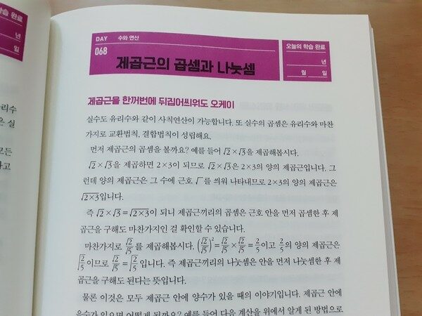 첫 번째 수와 연산에서는 숫자의 시작에서 부터 자연수, 정수, 유리수, 실수, 복소수 등에 대해 그 개념을 잡을 수 있다. 외우기보다는 여러 번 읽고 이해하는 방식으로 공부해야 한다. 이외에도 에라토스테네스의 체, 단위분수, 최소공배수, 최대공약수, 기약분수, 통분, 합성수, 거듭제곱, 소인수분해, 절댓값, 제곱근, 드모르간 법칙, 벤다이어그램, 역과 대우, 증명 등 많은 것들을 읽을 수 있다. 수와 연산에 대해 93일 공부할 수 있다. 두 번째 문자와 식에서는 대수학에서 다루어지는 각종 개념을 비롯해 방정식, 부등식 등을 다루게 된다. 항과 차수, 일차식, 할등식, 미지수, 해 또는 근, 대입법, 곱셈공식을 이용한 분모의 유리화, 도형수, 이차방정식, 황금비, 금강비, 연립부등식 등을 64일동안 공부한다.