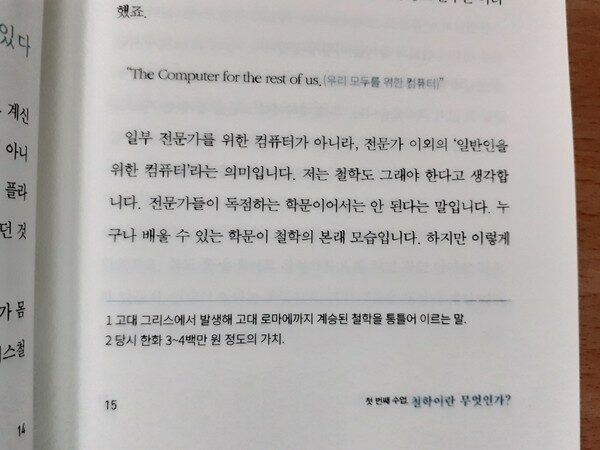 첫 번째 수업에서는 '철학'에 대해 알아본다. 철학은 구체적으로 생각하는 것이라고 할 수 있다. 철학이 구체적인 학문이라고는 해도 학문자체는 다소 추상적일 수밖에 없다. 모든 것을 개별적으로 생각하려고 하면 학문은 되지 않는다. 구체적인 학문이라는 측면에서 철학은 상상력과 관련이 있다. 상상력을 이용해 구체적으로 생각할 수 있게 되기도 하고 반대로 되기도 한다. 인간이 행위는 가치판단을 통해 이루어진다. 행위의 주체가 행위의 목적이나 목표를 의식하지 못하고 있는 경우도 많다는 것이다. 행위를 통해 자신이 얻고자 하는 바를 명확히 알면 그것을 달성하기에 더욱 효과적인 수단이 무엇인지 가늠할 수 있게 된다.