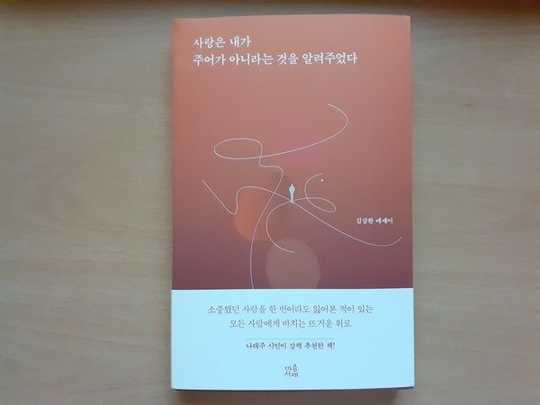 <사랑은 내가 주어가 아니라는 것을 알려주었다>는 아내가 갑자기 세상을 떠나고 남은 그리움과 슬픔을 극복해가는 이야기를 하고 있다. 누구보다 힘든 시간을 과거의 아름다웠던 추억을 회상하고 현재를 열심히 살아가면서 슬픔을 이겨내고 있다.