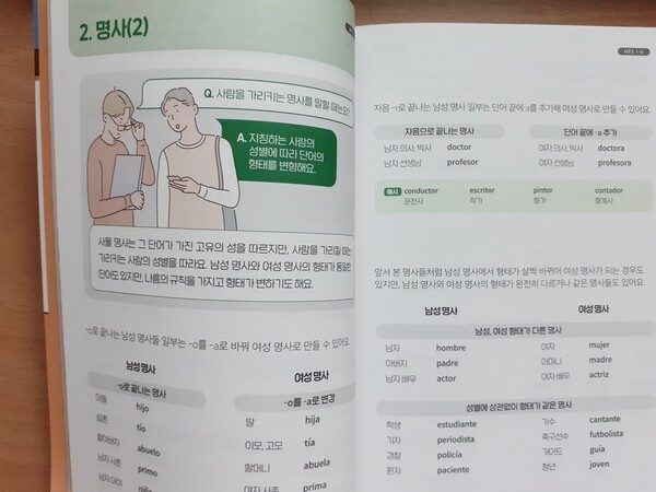새로운 언어를 배운다는 것은 설레기도 하지만 끈기와 시간이 필요하기에 쉽게 포기하기도 한다. 언젠가 스페인어를 배우고 싶고 스페인어를 사용하는 나라로 여행을 가고 싶었다. 이제는 더 이상 '언젠가'라는 말로 미루고 싶지 않고 바로 공부를 시작해야겠다. <가벼운 스페인어>는 스페인어를 독학으로 공부할 수 있게 하고, 기초를 다져주고 기초문법까지 잡을 수 있게 한다. 우선 스페인어는 알파벳을 사용하지만 그 발음은 영어와 다르다. 알파벳의 발음부터 익혀본다. 그리고 스페인어에서 중요한 '강세'에 대해서도 공부할 수 있다. 스페인어 원어민처럼 말하기의 첫 단추가 바로 강세라고 하는데 올바르게 강세를 주고 읽는 법을 알려준다. 또 스페인어는 한글에 없는 큰 특징이 하나 있다. 그것은 단어에 성별이 있는데 명사에 따라 여성과 남성의 성별이 있다. 규칙적이기도 하지만 예외의 경우도 있어 익혀야 한다.