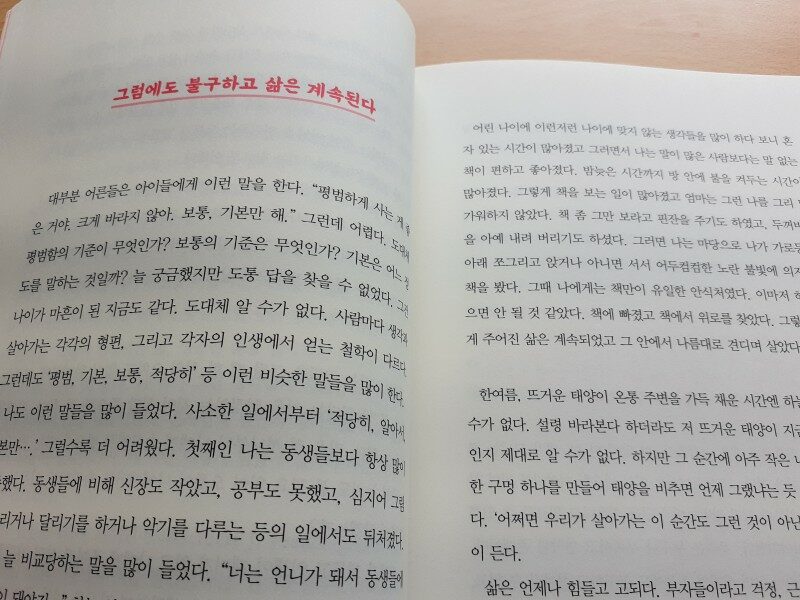 가장 인상이 깊었던 시는 '삶도 그림처럼'이다. 미술관이나 박물관에서 그림을 볼 때 눈 앞에서도 보지만 한 발짝 떨어져 보기도 한다. 그림은 가까이서 보는 것과 조금 떨어진 위치에서 보는 걱이 다르게 보일 수 있다. 우리의 삶도 우리가 서 있는 곳에서 바라본 모습과 조금 떨어진 곳에서 보는 모습이 다를 수 있다. 가끔은 우리가 서 있는 곳에서 바라본 모습이 삶의 전부라고 판단하면 우리는 인생의 멋지고 아름다운 풍경을 놓칠지도 모른다는 것이다.