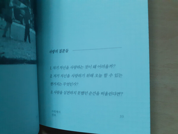 나를 사랑하는 것이 타인을 사랑하는 것의 시작이라고 한다. 그처럼 타인을 향한 태도는 곧 자신을 향한 태도이기도 하다. 타인을 대하는 방식에서 자신을 대하는 방식을 반영하기 때문이다. 상대를 만나 인사하고 안부를 묻는 것, 약속 시간에 일찍 도착하는 것, 늦으면 미리 연락하는 것 등 이런 작은 행동들이 타인에게는 존중으로 느껴질 수 있고 그 존중은 곧 타인에게서 나에게로 돌아온다. 사랑은 감정인지, 행동인지 궁금하다. 사랑은 감정이지만 그건 자신만의 감정이고, 그 감정을 상대가 알 수 있게 행동해야 한다. 사랑을 표현하기 위해 웃고, 따뜻하게 상대의 손을 잡아준다. 사랑은 표현하지 않으면 알 수 없는 감정이기 때문이다. 말하지 않으면 전해지지 않고 행동하지 않으면 느낄 수 없는 것이 사랑이다.