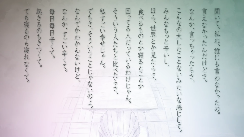 みんなもっと辛いし、ほら、世界とか見たらさ、食べるものとか寝るとことか困ってる人だっているわけじゃん。