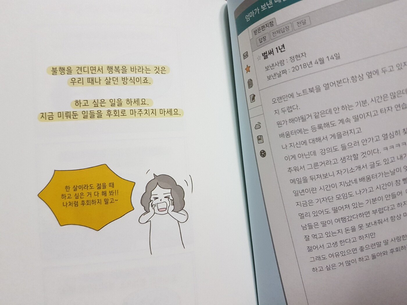 환갑을 넘긴 엄마가 컴퓨터를 배우러 다니고 더듬더듬 메일을 써서 보내오면서 점 점 쌓이게 되자 엄마의 메일을 그림으로 그려 한권의 책으로 내게 된 55년생 현자씨! 자식들 다 키우고 빈자리가 헛헛해지자 그제서야 스스로를 위한 배움에 도전하고 글을 쓰고 블로그 기자가 되어 열심히 스스로의 삶을 당당히 살아가는 엄마의 모습을 딸의 관점에서 그리고 담은 책을 보며 어느새 80 나이를 바라보며 하루하루 점점 더 늙어가는 엄마를 떠올리게 된다. 엄마도 언젠가 그동안 못배운 공부의 한을 풀겠다고 노인학교에 등록을 하고 책가방을 사고 숙제를 걱정하던 모습이 생생하게 떠오른다. 그리고 이제는 노래교실에 가고 수영을 하러 다니고 친구들과 나들이를 다니며 자신의 삶을 살아가면서도 자식에 대한 걱정의 끈을 놓지 않는 엄마!