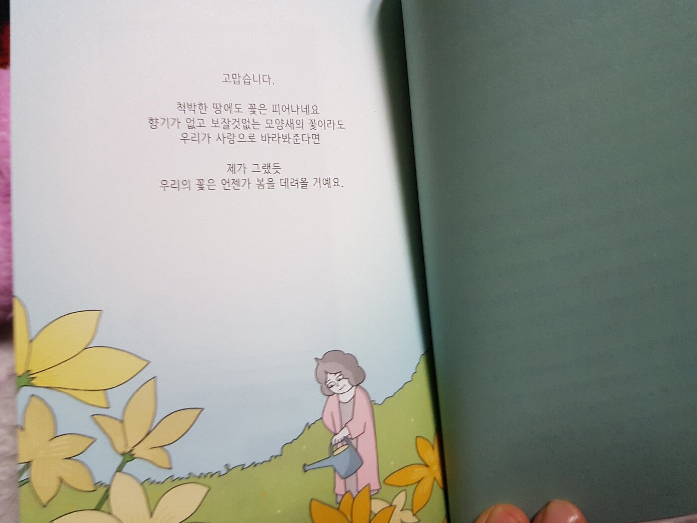 작가의 글을 읽을때면 늘 소박하고 순박한 마음이 되는 까닭은 바로 작가 자신이 무척 순박하고 소박하기 때문인듯하다. 조촐하고 다소곳이 나이든 작가를 떠올리며 책을 덮는다. 그리고 손을 뻗으면 닿을 수 있는 가까이에 책을 두려한다.