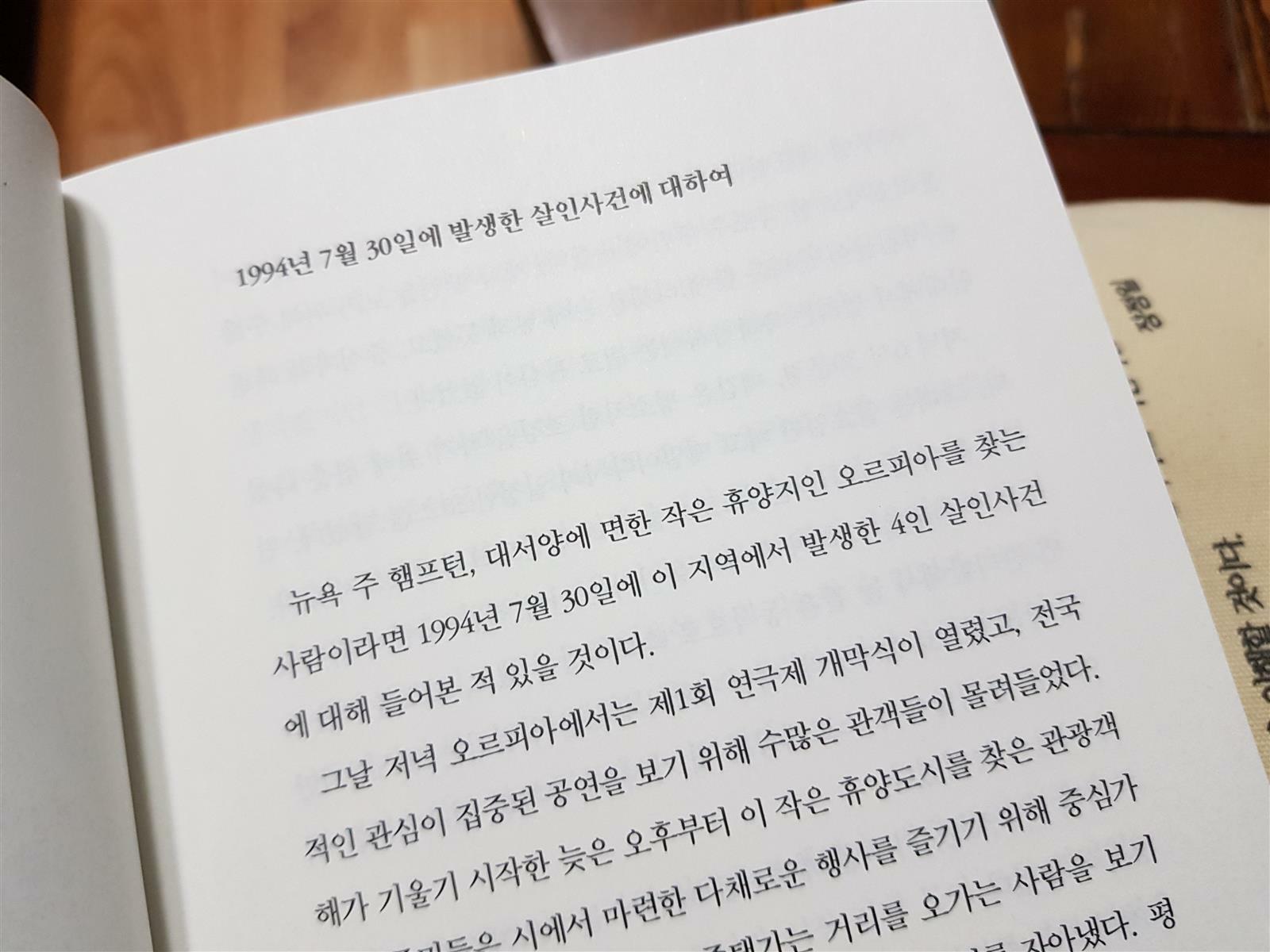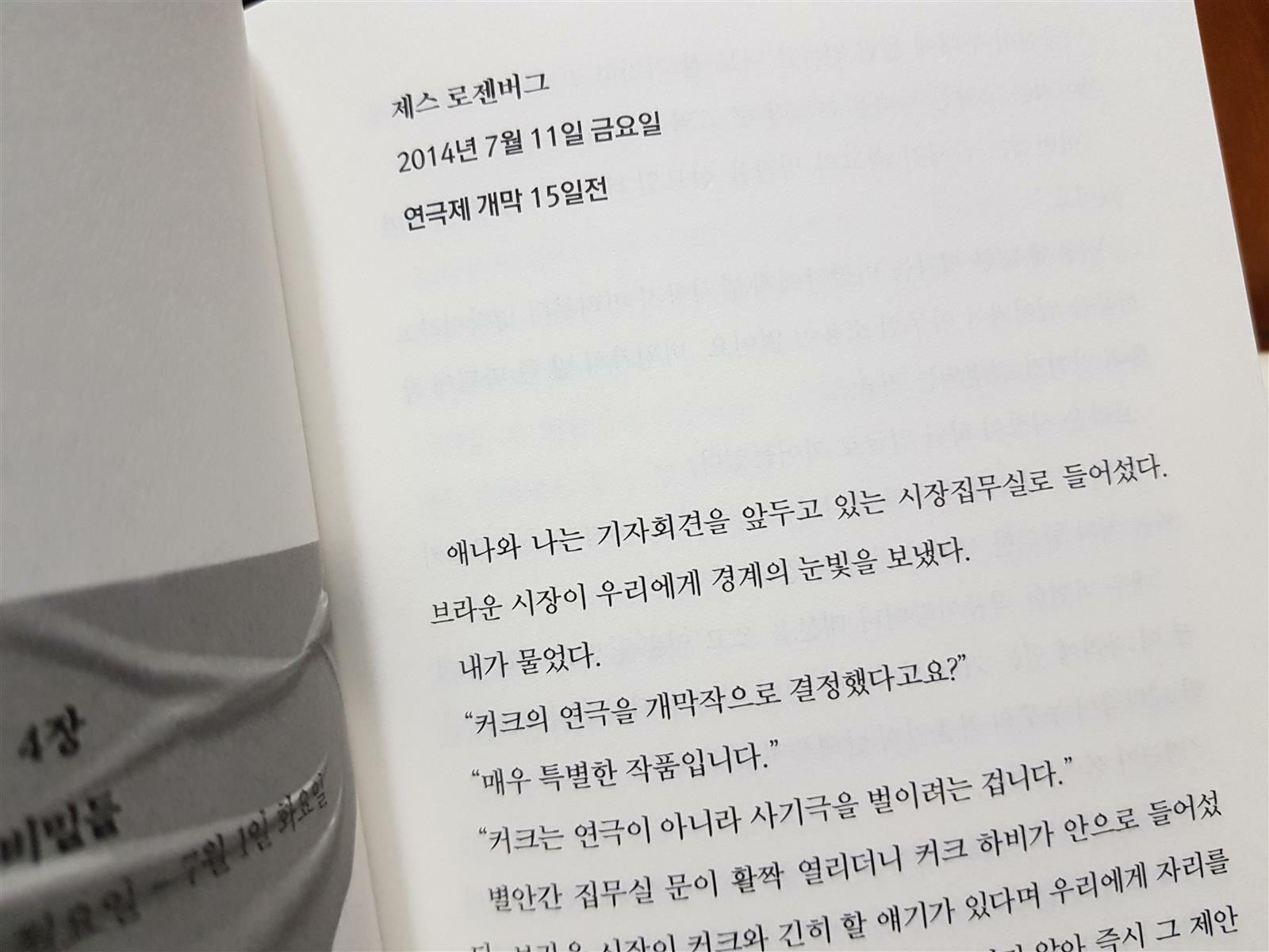 20년전 경찰 서장이었지만 사람들에게 따돌림당하고 쫓겨난 커크가 들고 나타나는 다크나이트 희곡 대본을 무대에 올리게 되는 전개는 말도 안되는거 같지만 희안하게 착착 맞아 들어가게 된다. 작가는 절대로 각각의 캐릭터의 비밀스러운 사연을 미리 들려주지 않음으로 독자들을 더욱 궁금하게 만들어 책장을 넘길 수 밖에 없게 글을 쓰고 있다. 빨리 책장을 넘겨 누가 범인인지 알고 싶은 마음과 갈등하게 만들지만 오르피아의 연극제를 둘러 싸고 일어난 20년전의 이야기와 지금 현재에 벌어지는 이야기, 그리고 20년전 사건을 맡아 종결 지었던 제스와 데렉 두 사람이 밝히지 않은 앙금같은 나타샤에 대한 이야기, 경찰로 살아가면서 활약하고 싶어하는 애나가 사회 남성우월주의와 편견에 맞서 당당하게 살아가려는 이야기와 친구와의 사건 이후로 인생을 비참하게 살아가는 한 소녀의 이야기까지 무엇 하나도 놓칠 수 없는 이야기들이 펼쳐지고 있어 절대 뒷장으로 급하게 책장을 넘기지 못한다.