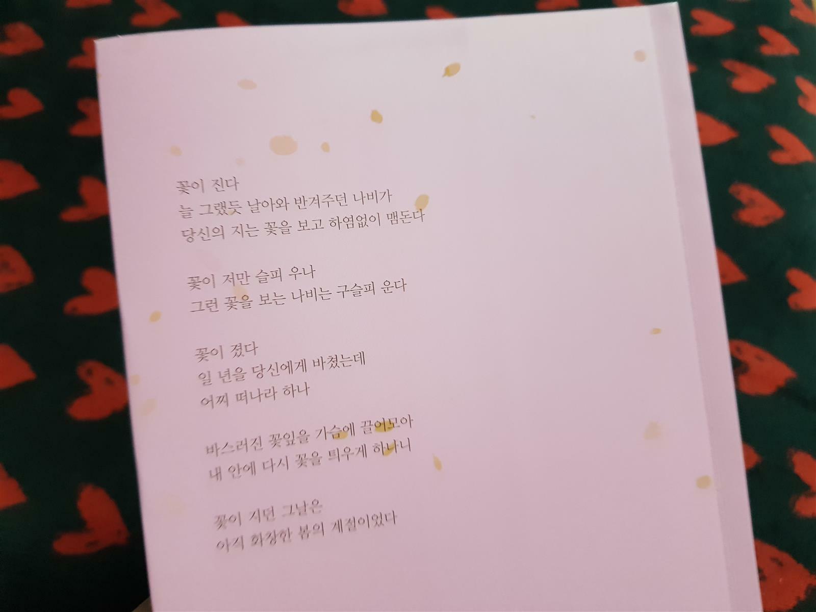 시집이 좀 늦게 배달된듯 하다. 봄은 이미 다음해를 기약하고 있으니! 하지만 여름 더위에 지쳐가는 누군가에겐 반가울 수 있는 시집! 일단 표지가 벌써 마음을 사로잡는다. 꽃한송이 지고 있는 봄날의 어느 하루같은 표지!