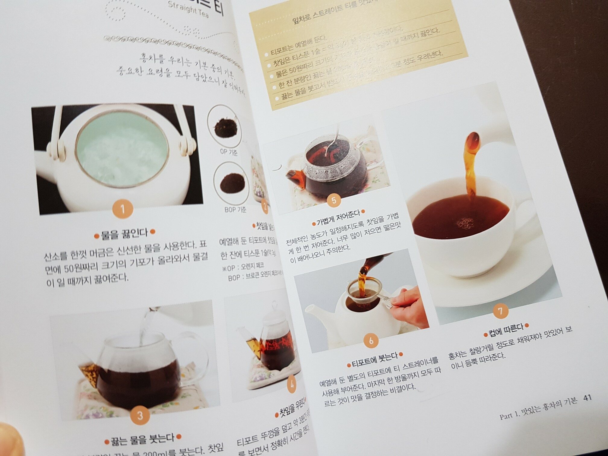 매일 홍차를 마시지만 홍차의 맛이 참 다르게 느껴진다. 홍차의 맛에 영향을 끼치는 다구들과 물과 홍차의 종류등에 대한 이야기가 흥미롭다. 홍차의 물은 정수기물을 사용하면 더 좋겠지만 수돗물로도 충분하며 방금 받은 수돗물을 50원짜리 기포가 올라오도록 팔팔 끓이는 것이 중요하다. 끓인 물을 다시 끓여 우리는것은 피하는것이 좋다. 또한 홍차의 종류와 홍차를 우리는 시간과도 무척 영향이 크다. 찻잎 3g에 200미리 끓는 물로 3분을 우리는 것이 좋고 잎차를 우릴때 쓰는 다구들의 쓰임새와 티백을 우릴때의 방법의 차이 또한 홍차맛에 큰 영향을 끼친다. 밀크티, 로열밀크티, 아이스티 만드는 방법도 친절히 알려준다.