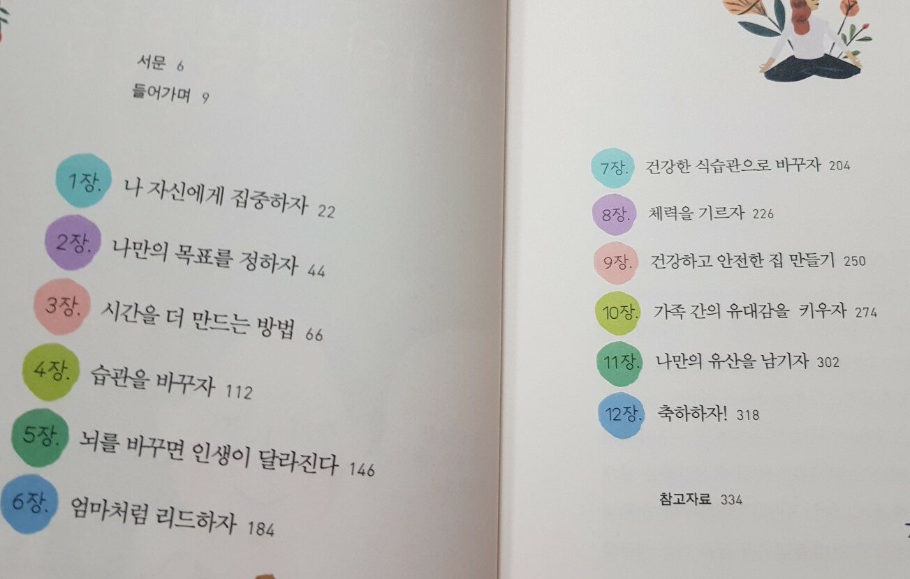 긍정적인 습관 변화로 엄마의 아침 루틴 연습은 정말 유용한거 같아요. 늘 생각은 하는데 이걸 실행이 잘 옮기지 못하거든요. 이번을 기회로 아침 10분을 자신이 하고자 하는 것에 신성한 가치를 두고 절대 협상 불가한것으로 삼아 삶의 주도권을 잡아야 한다는 것에 무척 공감하게 됩니다. 이외에 건강한 식습관과 엄마에게 필요한 운동, 독성물질 없는 친환경적인 공간 만들기, 가족간의 유대를 키우는 팁, 나만의 유산 남기기등으로 마무리 됩니다.
