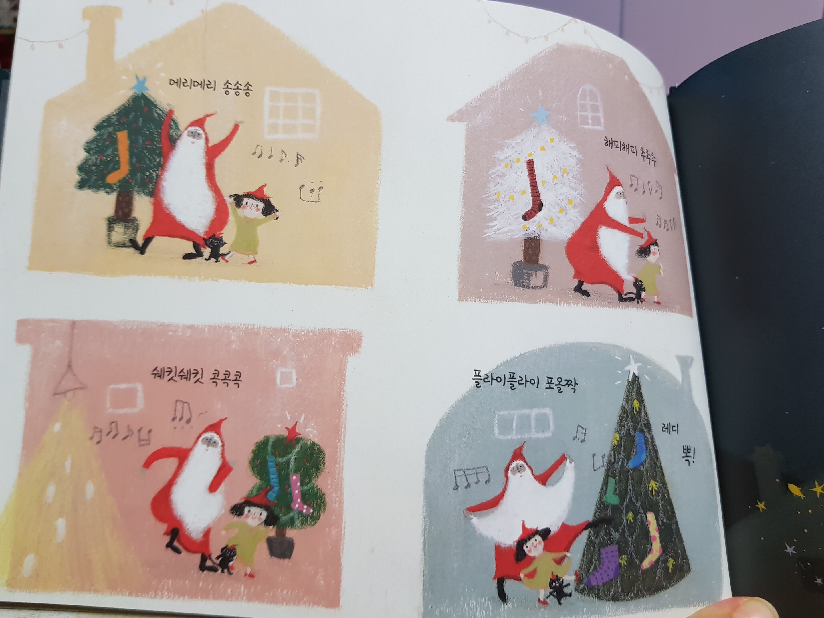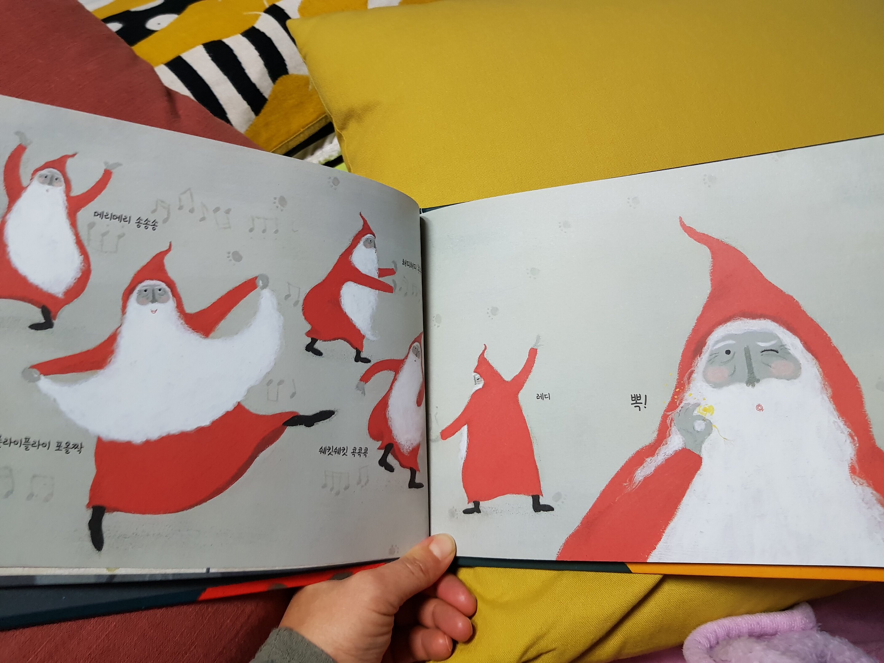 귀엽고 깜찍한 그림이 인상적인데다 산타가 새가되어 날아가는 마법같은 장면은 진짜 판타스틱한 산타와 함께 춤을! 우리도 올해는 아이들과 함께 마법의 주문을 외우고 산타춤을 추며 산타를 기다려볼까요? 메리메리송송송, 해피해피추추추, 쉐킷쉐킷콕콕콕, 플라이플라이포올짝 레디뽁!^^