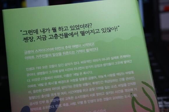 참 재미난 책이다. 27층에서 금붕어 한마리가 고공 낙하하는 4초라는 그 시간동안 사랑과 이별, 탄생과 죽음등 인생의 모든 일들일 일어난다니! 처음엔 그 말을 믿지 못했지만 챕터 하나하나를 읽어 나가는 동안 이야기속에 등장하는 캐릭터에게 푹 빠져 이언의 4초동안의 곤두박질은 생각지도 못한채 책을 휘리릭 읽게 된다. 그리고 찰나의 순간일거 같은 정말 그 짧은 4초의 시간동안에 인생의 희노애락이 모두 일어난다는 것에 공감하게 된다.