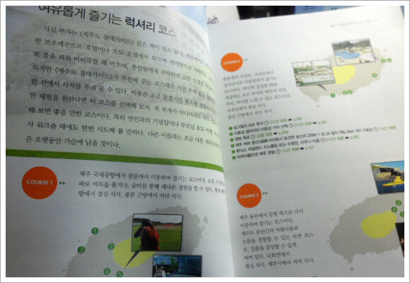 보통의 여행서들을 보면 지도가 첨부되어 있고 명소와 맛집과 숙박이 함께 소개되어 있듯 이 책 또한 그러하다. 그런데 커다란 지도를 펼쳐 동서남북을 좀더 세밀하게 관광하고 싶은 사람을 위해 각각의 지역을 확대해서 여유로운 럭셔리코스, 20대를 위한 짠돌이 코스, 나홀로 코스, 비올때 로맨틱 코스등 테마가 있는 여행코스와 제주도의 백미인 올레길과 한라산과 오름과 우도에 대한 소개와 함께 맛집과 숙박까지 직접 발로 뛰고 보고 느낀것들을 담아 자세하고 친절하게 그리고 실속있게 소개하고 있는 여행서다.