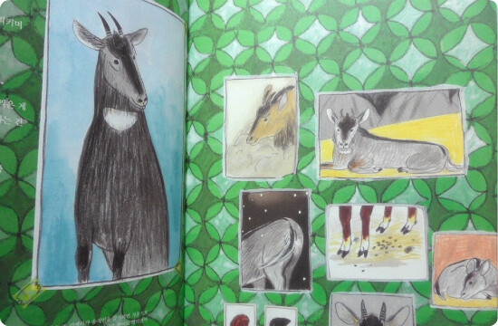 송이는 옆집에 사는 소라언니네 집에 갔다가 벽에 잔뜩 붙은 산양 사진을 보고 산양을 알게 되요,