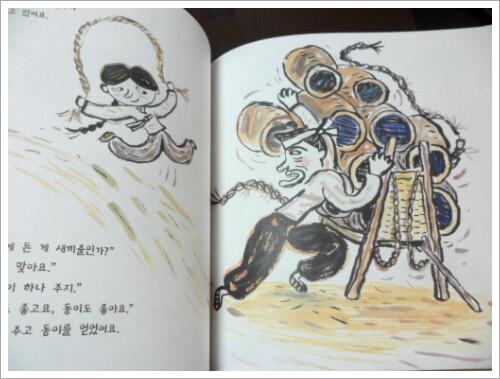 한고개를 넘으니 동이장수가 마침 모자란 새끼줄을 동이와 바꾸자고 하네요.