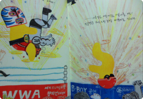 그림속 동생의 표정도 그렇지만 '형꺼 형꺼'라고 써놓은 글자들이 동생의 시위를 보는거 같아요,