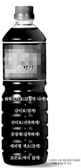 글루타민산나트륨으로 감칠맛을 내고 감미료로 단맛을 살짝 더한다. 거기에 산미료를 써서 산뜻함을 만들고 증점제를 넣어 걸쭉한 느낌을 보탠다. 색깔도 간단하다. 캐러멜 색소가 해결사. 여기에 보존료를 넣어 상하지 않게 한다. 겉모습은 거의 차이가 없는 간장이 탄생한 것이다.