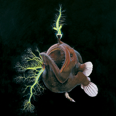 | ▲ 나무수염아귀,Illuminated netdevil- '그물로 물고기를 잡는 두꺼비'라는 뜻의 학명을 가졌다. 빛이 전혀 들지 않는 심해에 살면서 발광기관이 유독 발달한 아귀 몇종을 책속에서 만날 수 있다. 아래에 붙어 있는 것은 수컷인데 평생을 암컷에게 붙어 살아간다.(기사내용참고) |