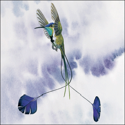 | ▲ 물까치라켓벌새,Marvellous spatulettail-세계에서 꼬리깃털이 딱 4개인 종은 이것뿐. 이 독특한 꼬리깃털 끝은 무지개빛으로 화려한 부채같다. 짝짓기가 끝나면 버리는 과시용 깃털을 가진새도 있건만 이 벌새는 평생을 달고 살아간다. 이 꼬리를 달고 살아가자면 에너지도 많이 소모될 텐데... |