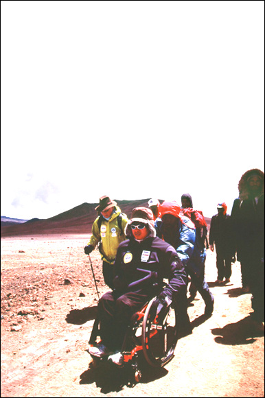 "저는 꼭 가야 되거든요. 처음에는 이런 몸으로 산에 오르는 게 가능할까 의문이 들었어요. 사람이 처음 걸어간 발자국은 그대로 다른 사람에게 길이 된다고 하잖아요. 우리나라에서 그 높은 산에 올라간 장애인은 없는 걸로 알고 있는데, 더구나 휠체어 장애인이…. 내가 올라갔다 오면 다른 장애인들에게 도움이 되지 않을까요. 그렇기 때문에 저는 꼭 가야 해요"휠체어 육상선수 이윤호씨의 얘기다. 예비산행인 도봉산행을 두 손, 핸드워킹으로 등반 후 윤호씨의 자신감에서 오는 각오다.