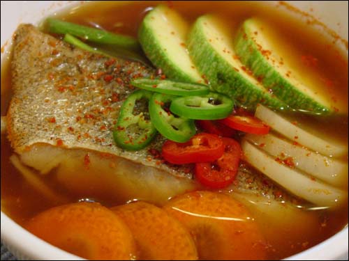 ▲ 다 끓여서 익힌 생선매운탕에 저렇게 파란 고명이 오른 것을 본 일이 있으십니까? 사진 때문에 매운탕을 다 끓인 후 고명을 얹은 것이지요. 파란색 야채가 김 때문에 숨이 죽을까봐 얼마나 마음을 졸였던지요.