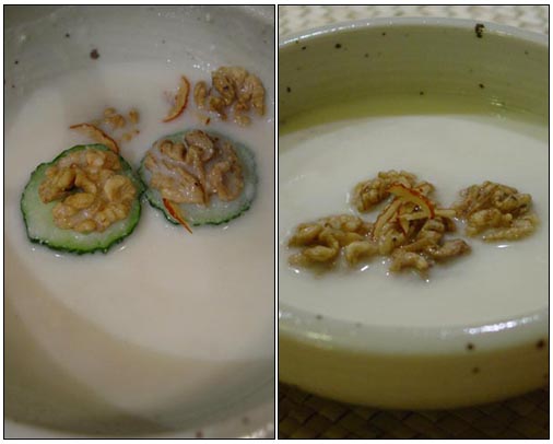 호두죽을 만들던 날, 죽 위에 호두 반 알씩이 가지런히 올라가야 음식의 식감도 살고 사진도 잘 나올 텐데 이 호두알이 워낙 무거워서 죽 아래로 자꾸만 가라앉는 것이었어요. 할 수 없이 방책을 마련한 것이 죽 아래에 오이 동강을 잘라 고임을 하고 호두알을 올린 후 다시 죽을 부어서 오이를 가리는 '공사'를 하는 것이었지요.