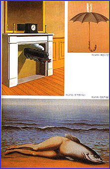 여기엔 집 안 벽난로를 뚫고 기차가 튀어나오는 '못 박힌 시간', 우산 위에 물이 담긴 유리잔이 올려져 있는 '헤겔의 방학', 다리는 사람인데 몸은 생선인 인어공주를 거꾸로 해놓은 모습의 괴기스러운 '집학적 발명' 따위가 도마 위에 올려진다. 글쓴이는 여기서 관계가 전혀 없을 것 같은 사물들의 만남을 통해 '이상한 만남'을 표현함으로써 충격을 주고 있음을 얘기한다.