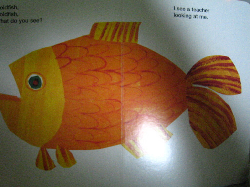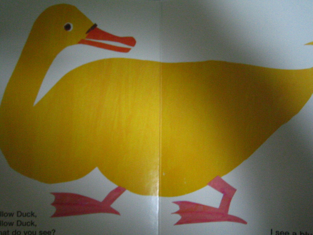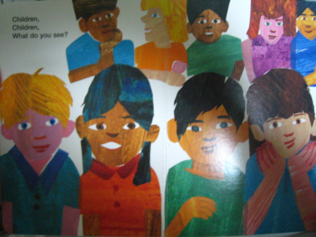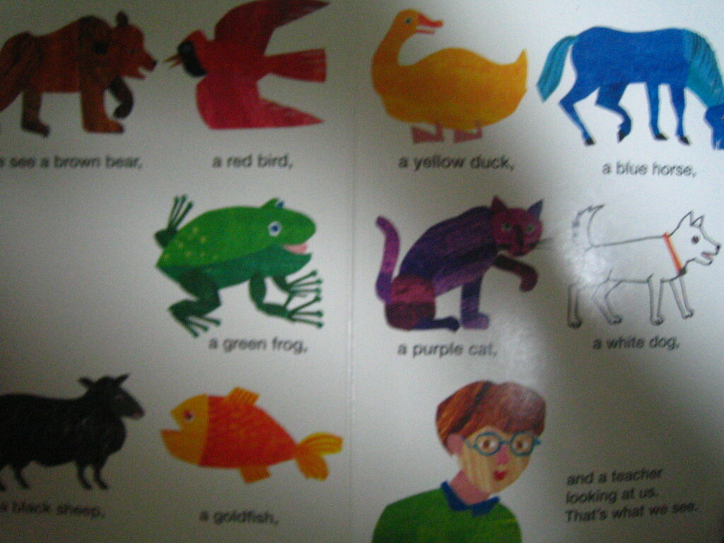 등장 인물들은 모두 제 각각의 색깔과 누군가를 바라보고 있다. 브라운 베어는 자신을 보고 있는 빨강색 새를 보고 있다. 레드 버드는 자신을 보고 있는 노랑색 오리를 보고 있다. 옐로우 덕은 푸른 색 말을, 블루 호올스는 초록색 개구리를, 그린 프로그는 보라색 고양이를, 퍼플 캣은 흰색 개를, 화이트 독은 검은색 양을, 블랙 쉽은 황금색 물고기를, 골드 피쉬는 선생님을, 선생님은 이 모든 동물들과 선생님을 보고 있는 아이들을 바라보고 있다.