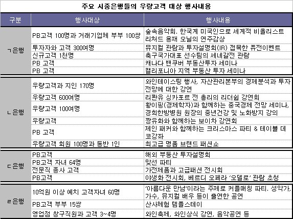 은행들이 일반 고객들에게 상품설명도 제대로 하지 않고, 가입 이후 관리는 더더욱 하지 않을 동안, 고액자산가들에게 제공하는 서비스는 놀라운 수준이다. 한 시중은행 PB는 “사실 고액자산 고객을 뺏기지 않으려고 쓰는 판촉비 규모와 이들에게 받는 수수료를 비교해보면, 확실히 적자”라고 털어놓기도 했다. 거액을 들여 외국의 명사를 초청해 강연회를 벌이는가 하면, 수시로 재테크 강연과 고급 교육프로그램을 제공한다. 최근엔 고객 자녀들을 위한 고급 맞선파티가 인기를 끌기도 했다.