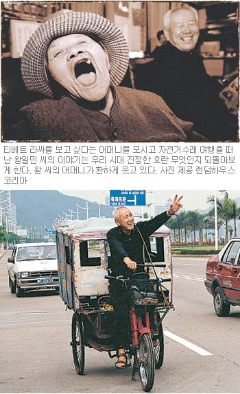 책을 읽다 몇 번이나 책장을 덮었습니다. 부끄러웠기 때문입니다. 가슴이 먹먹해져 더 이상 책장을 넘기기가 힘들었습니다. 하릴없이 서성거리며 한 숨을 돌리고 나서야 다시 책을 집어들 수 있었습니다. 책은, 일흔네살의 아들이 아흔아홉의 노모를 자전거수레에 태우고 중국 전역을 여행하는 사연을 담고 있습니다. 부인과 사별하고 자식들까지 분가시킨 왕일민(王一民)씨는 모든 것을 정리하고, 홀어머니가 살고 계신 흑룡강(黑龍江)성 탑하(塔河)로 갑니다. 이곳은 중국의 동북에서도 북쪽 끝이지요.